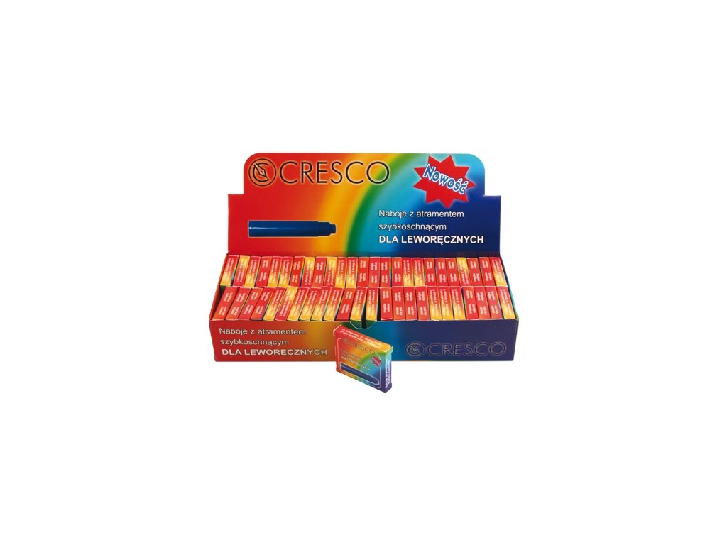 Náhradné bombičky do atramentových pier, s rýchloschnúcim modrým atramentom, vhodným pre ľavákov, balené po 6 ks v krabičke. Výrobca CRESCO bal / ks 50 kart. / bal 1000