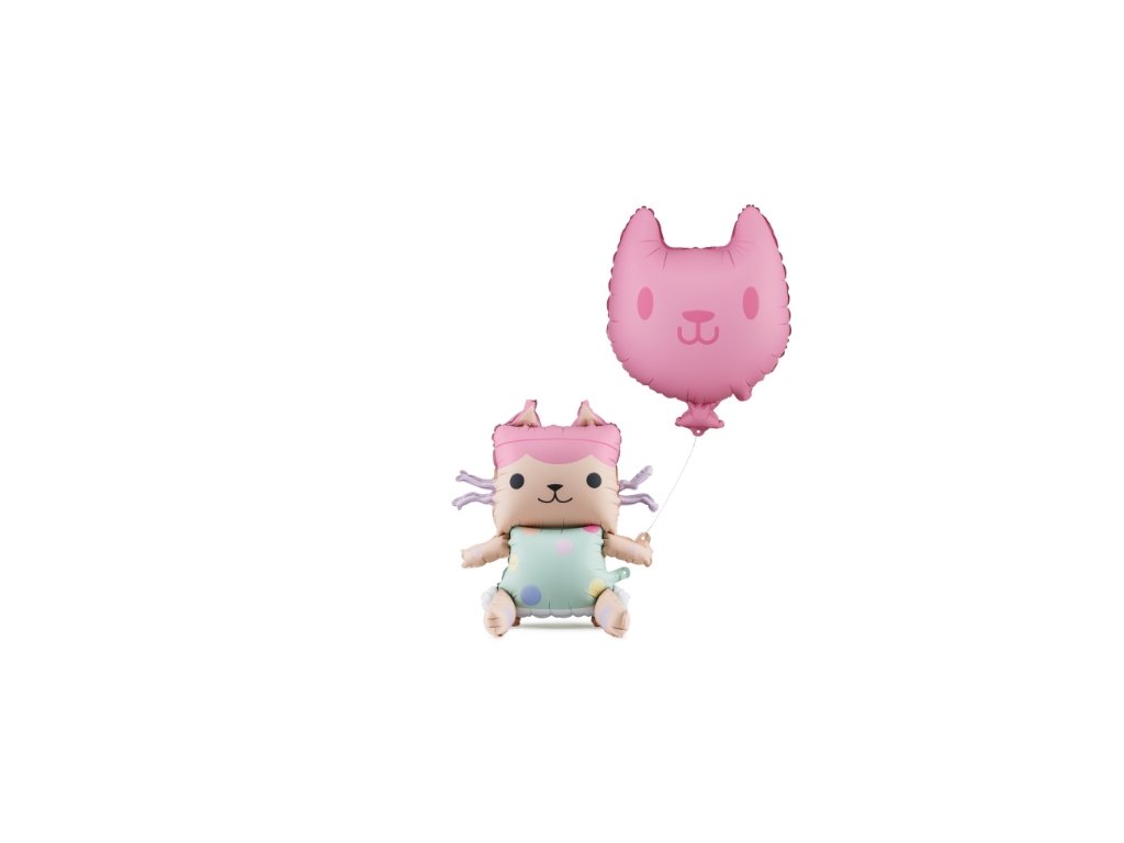 Sada 2 fóliových balónikov z Gábinina kúzelného domčeka - Baby Box určený na nafúknutie vzduchom a ružová mačka vhodná na hélium. Spoločne vytvoria kúzelný efekt na narodeninovej oslave. Rozmery po nafúknutí 43 × 46 cm a 35 × 37 cm.