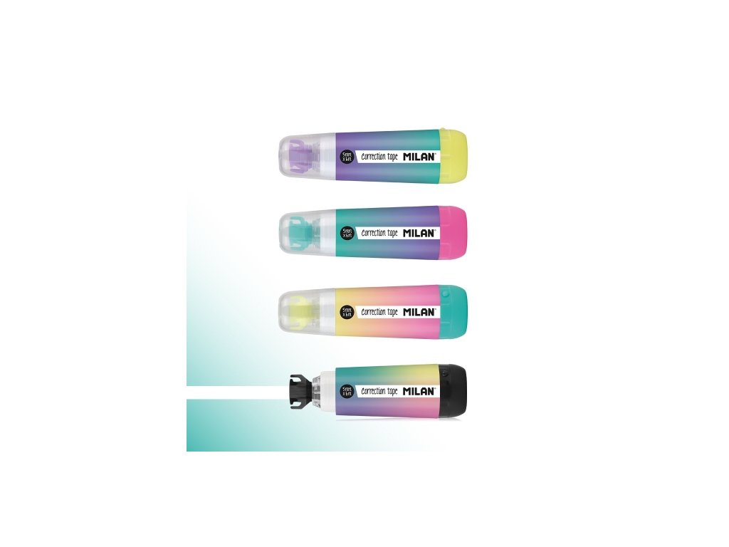 Guľatá suchá korekčná páska série Sunset. - opravy na všetkých typoch papiera, nezanecháva stopy na fotokópiách ani faxoch (rýchle, čisté a presné). - vhodné pre ľavákov vďaka otočnému hrotu o 360o 5 mm šírka x 6 m dĺžka Farby: biela, tmavomodrá, zelená a ružová. K dispozícii blistrové balenie s náhradnými páskami, kód BWM10467 Cena je za 1 kus. Kolekcia MILAN Sunset Výrobca MILAN Rozmery 125 x 125 x 125 mm (balenie)Diskusia