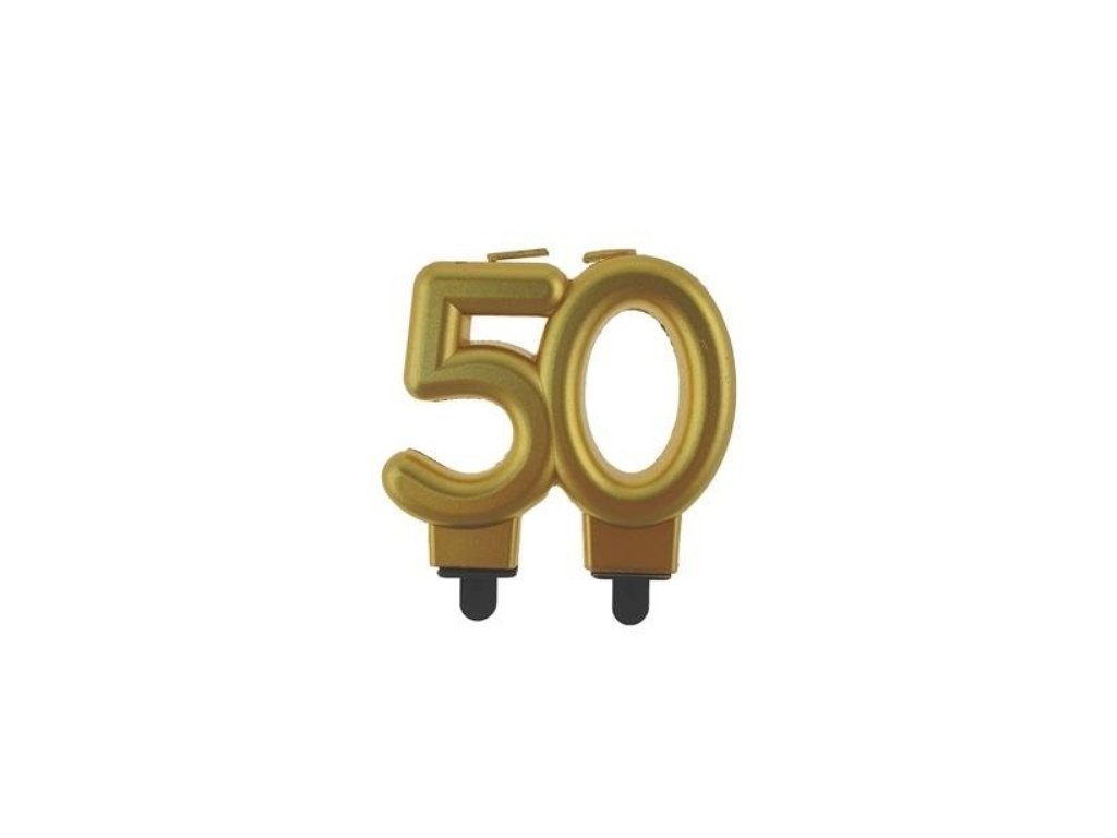 Narodeninová sviečka na tortu. Sviečka v tvare čísla 50. Farba: metalická zlatá. Balenie: 1 ks. velikost: 8 cm